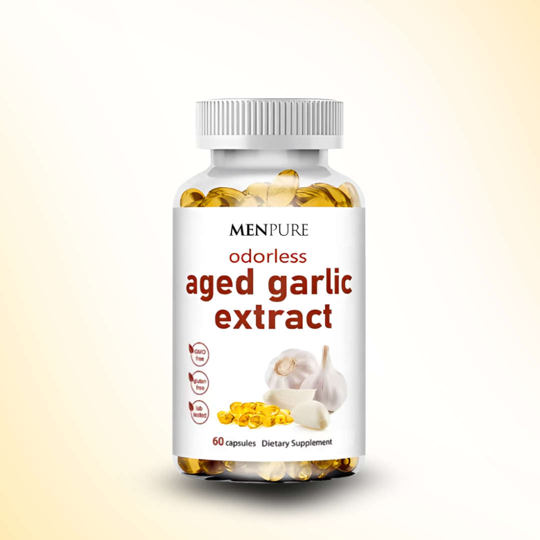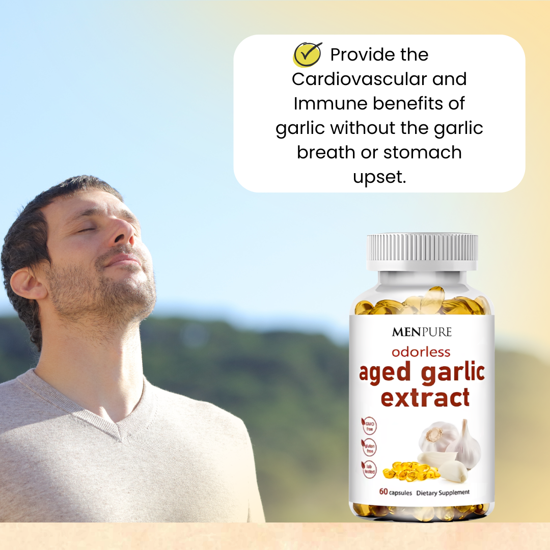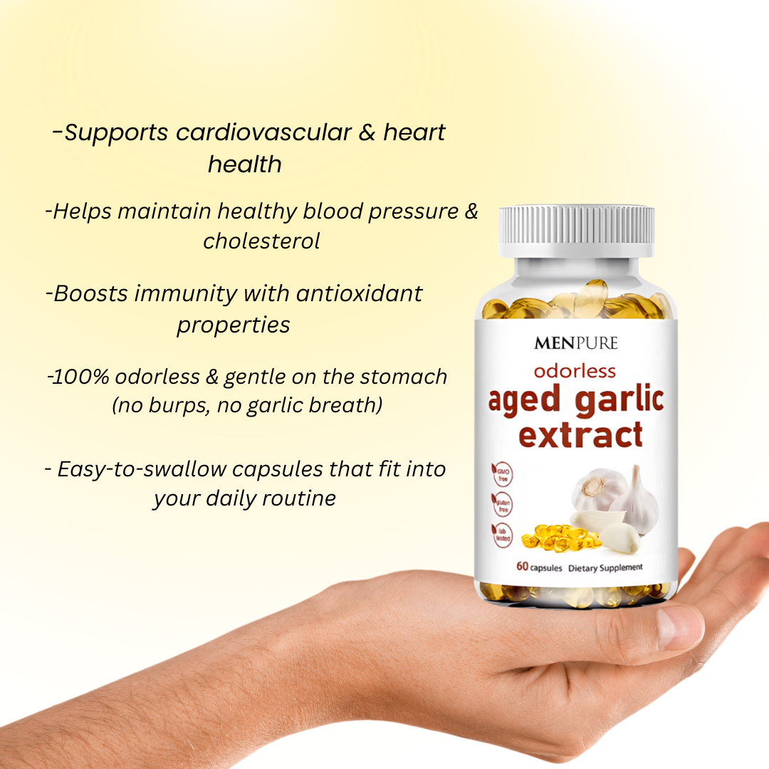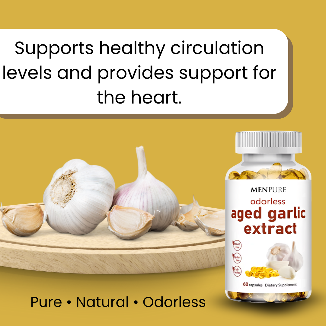 Our Menpure Odorless Aged Garlic Extract Softgels support cardiovascular health naturally, with research-backed compounds that help maintain healthy blood pressure, balanced cholesterol, and strong immunity, all in a small, odorless capsule that fits easily into your daily routine.
