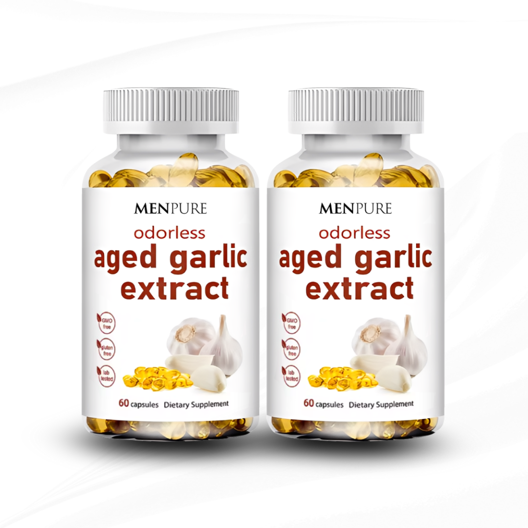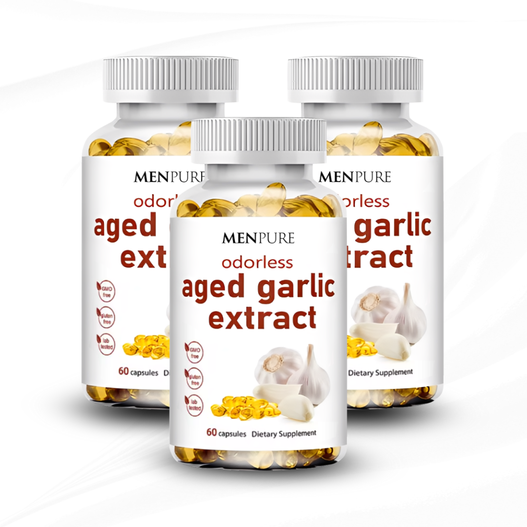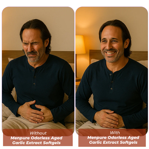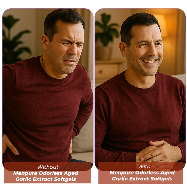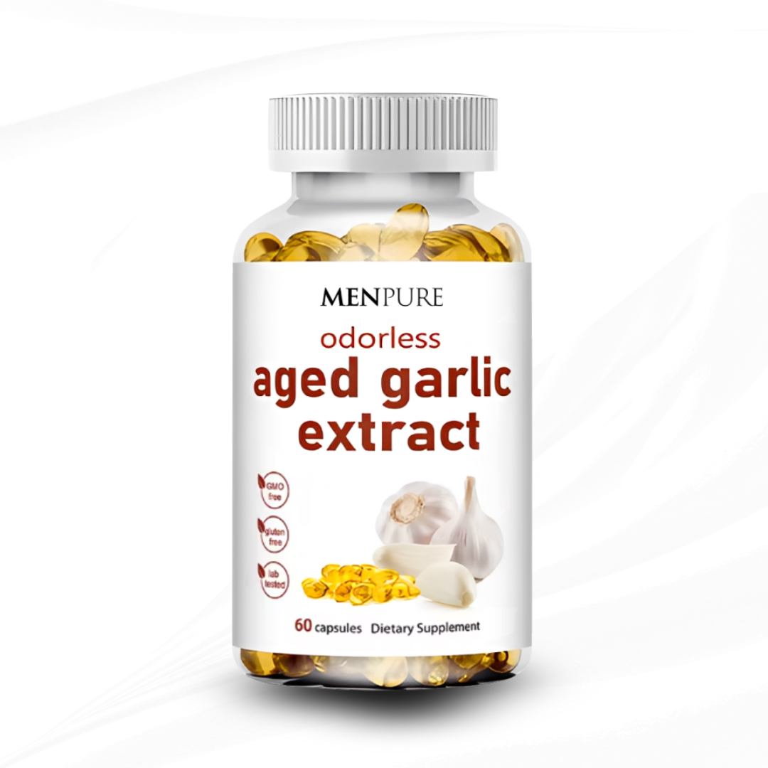 Our Menpure Odorless Aged Garlic Extract Softgels support cardiovascular health naturally, with research-backed compounds that help maintain healthy blood pressure, balanced cholesterol, and strong immunity, all in a small, odorless capsule that fits easily into your daily routine.