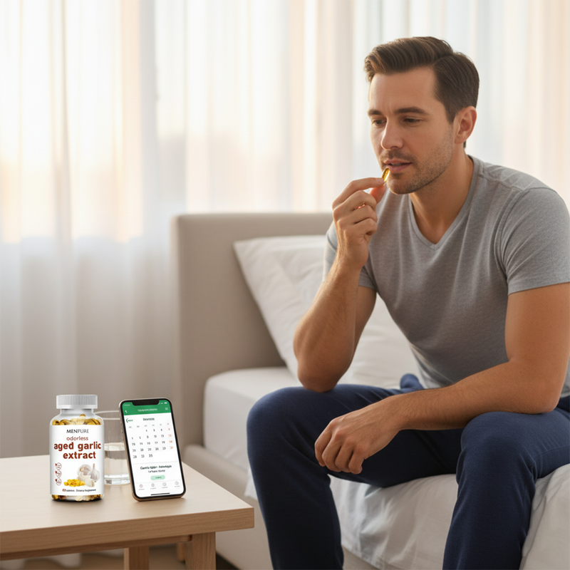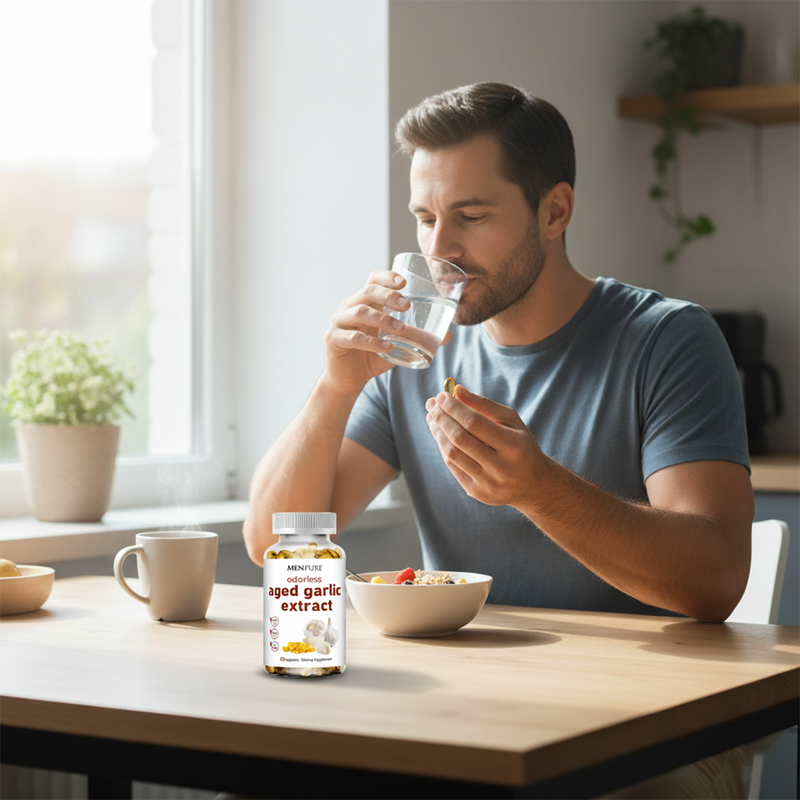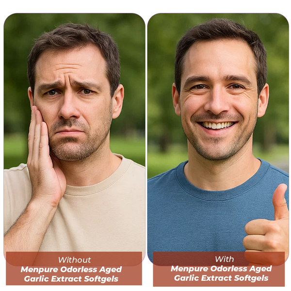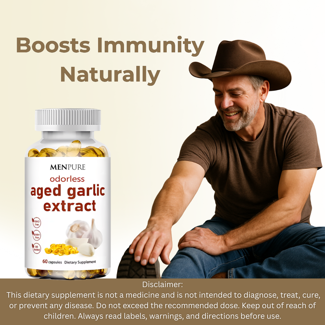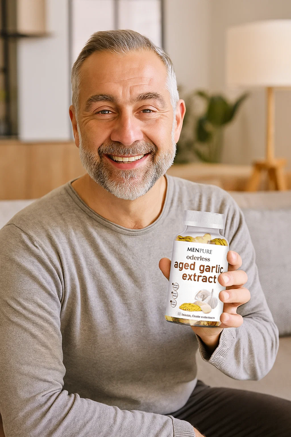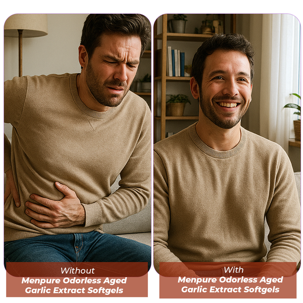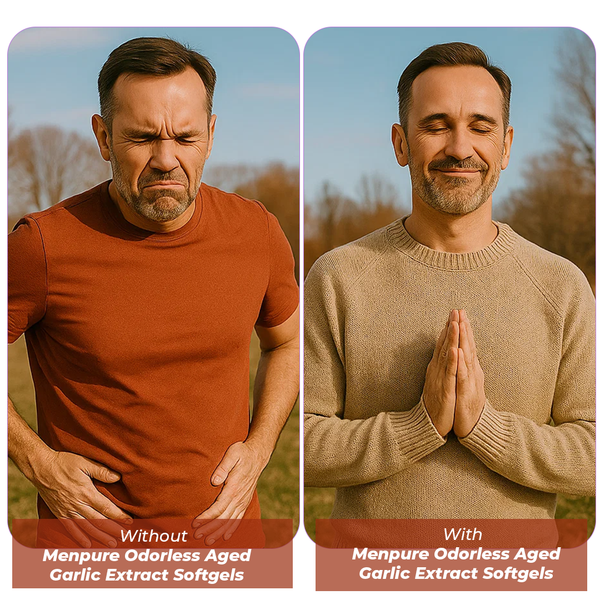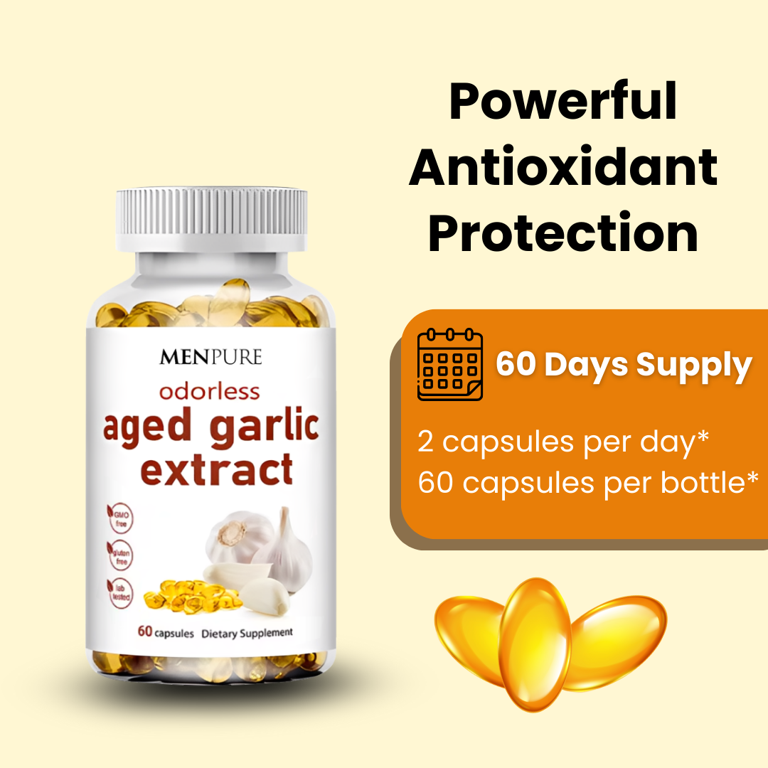 Our Menpure Odorless Aged Garlic Extract Softgels support cardiovascular health naturally, with research-backed compounds that help maintain healthy blood pressure, balanced cholesterol, and strong immunity, all in a small, odorless capsule that fits easily into your daily routine.