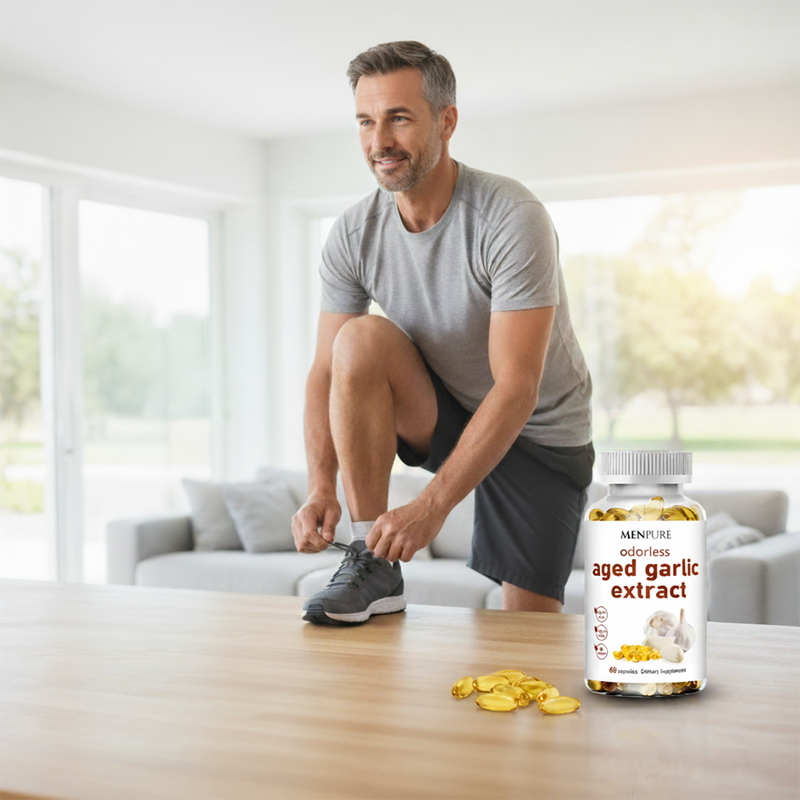 Heart health and circulation become more important after 40. Our Menpure Odorless Aged Garlic Extract Softgels, made with pure odorless garlic, provide natural support to help maintain healthy blood pressure, balanced cholesterol, and strong immunity, all without garlic breath.